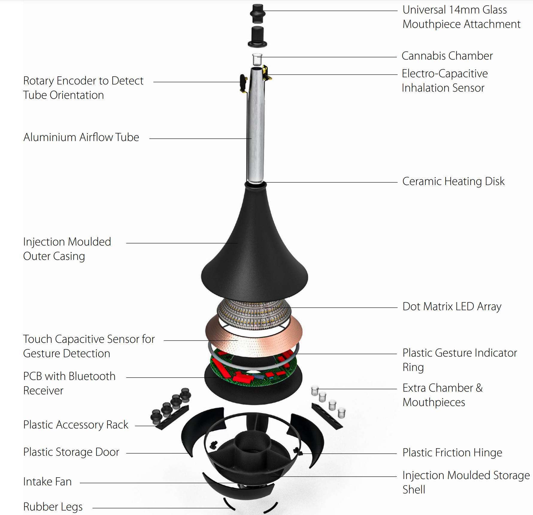 Working internals of a desktop vaporizer were used to determine the space needed and the layout of the refined concept from ideation. The size of accessories and paths for airflow aided in the development of the 3D-printed upper and lower shells.